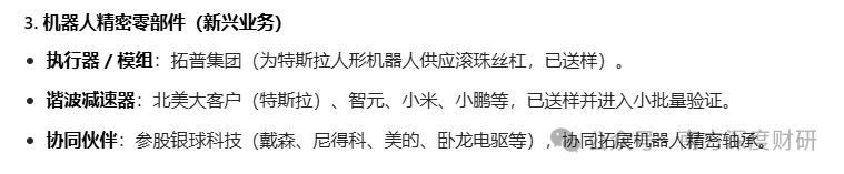 目前该业务已进入关键落地阶段:公司投入1.17亿元建设的机器人零部件生产基地,核心设备于2024年底陆续到位,2025年上半年已实现谐波减速器小批量生产,第二条产线也于2025年底达产,为规模化交付储备产能。
