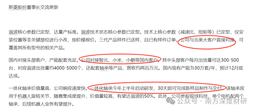 客户拓展方面,据媒体公开资料,在减速器报价方面,目前仅斯菱股份与海外两家进行报价,明年确认为国内首家北美客户谐波量产供应商;国内市场也在积极对接智元、小米、小鹏等头部企业,商业化落地加速可期。