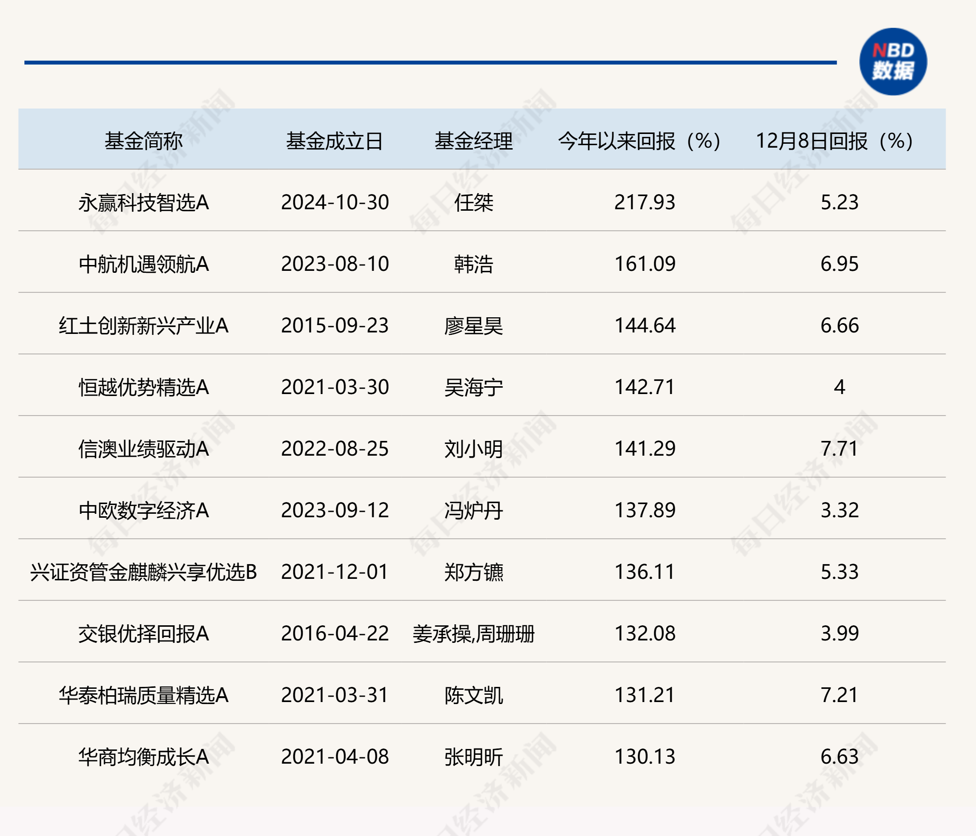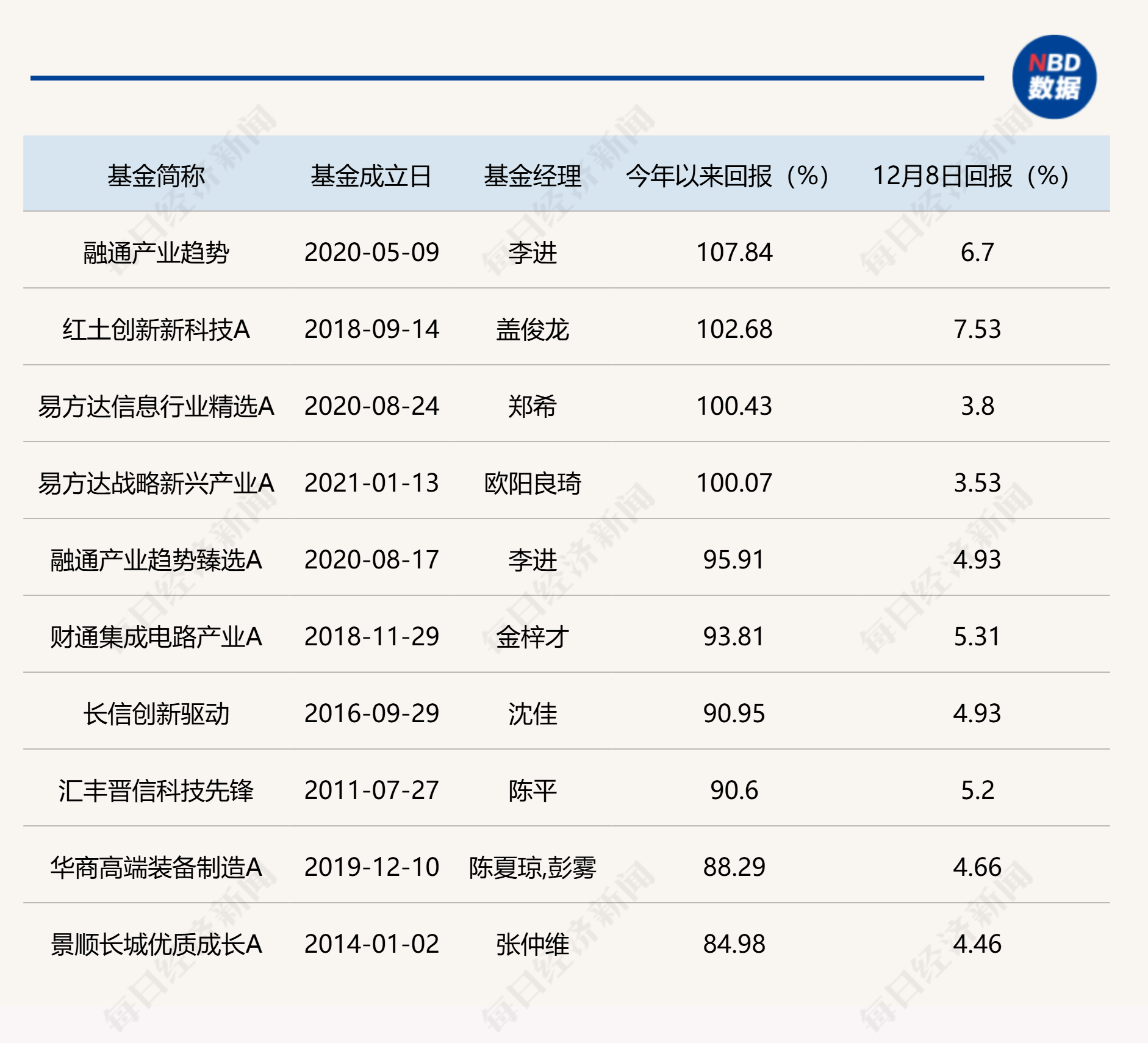 每经记者注意到,在12月8日涨幅靠前的产品中,不少也是今年的绩优基金。例如红土创新新科技A和红土创新科技创新基金,年内收益分别排在同类970只产品中的第2位和第87位,华泰柏瑞质量成长A和诺德新生活A也都排在同类超4000只产品中前1%的位置。