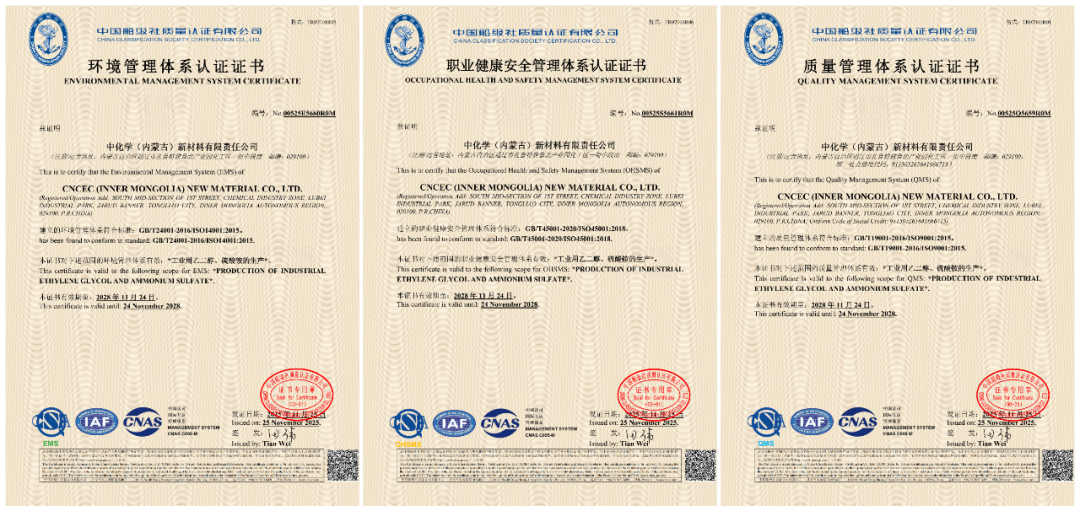 近日,通过权威机构严格、全面的现场审核与评估,中国化学工程东华内蒙古新材公司成功获得质量管理体系(ISO 9001)、环境管理体系(ISO 14001)、职业健康安全管理体系(ISO 45001)认证证书,标志着内蒙古新材公司在质量、环境、职业健康安全规范化、标准化、系统化管理方面迈上了新台阶,为实现更高质量、更可持续、更为安全的发展奠定了坚实的体系基础。