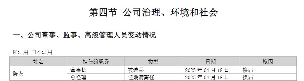 据天源迪科2025年半年报,2025年4月18日,陈友任期满离任总经理,但仍担任公司董事长一职。