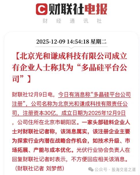 今日A股光伏板块尾盘异动,通威股份直线拉升、大全能源等集体走高,背后导火索是北京光和谦成科技有限责任公司的注册成立。这家注册资本30亿元的企业,被业内称为“多晶硅平台公司”,其核心使命是探索行业战略合作(技术升级、市场拓展、产能优化),更被视为终结光伏行业三年“价格战”的关键抓手。