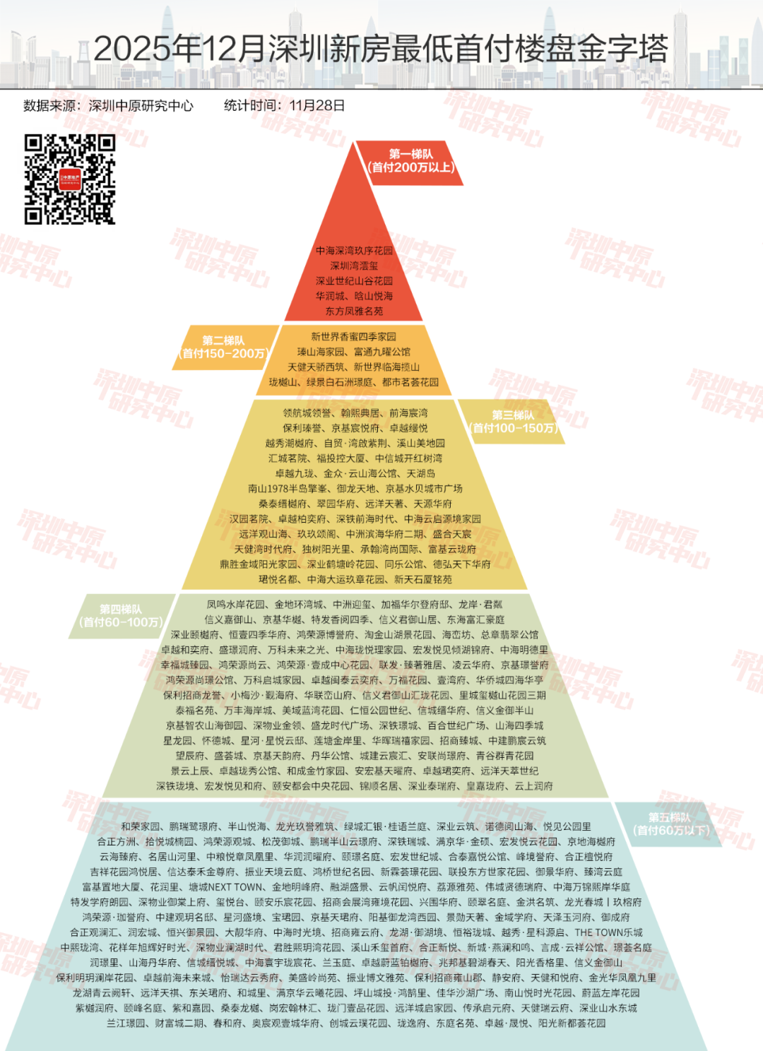 深圳中原研究中心更新了12月深圳在售新房最低首付金字塔图,