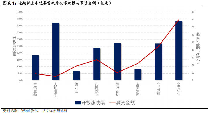 近一个月以来(2025年11月5日-2025年12月5日),大部分新上市股票的首次开板涨跌幅位于50%-450%水平区间内,首次涨跌幅最高的三家为C摩尔-U、大明电子、恒坤新材,分别达到433.21%、419.57%、270.51%。大部分新股募资金额位于5-30亿元水平区间内,其中募资金额最高的三家为C摩尔-U、C中国铀、南网数字,分别为80、44.4、27.14亿元。