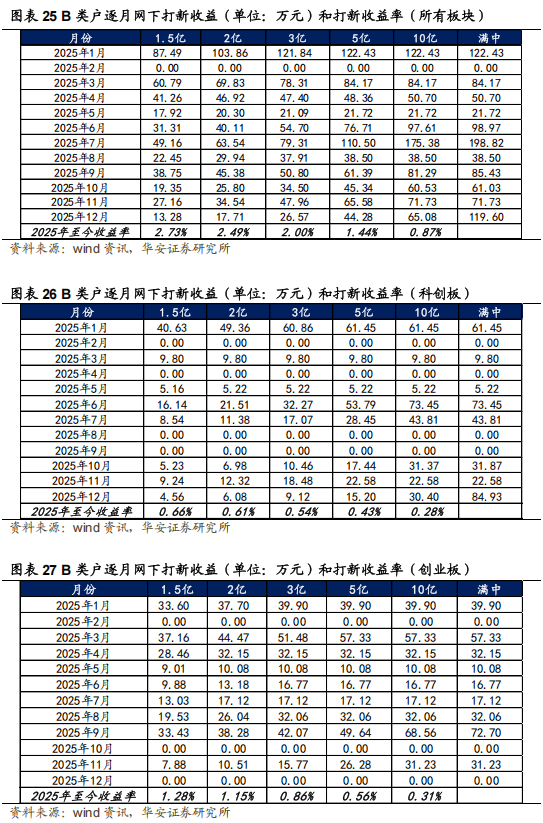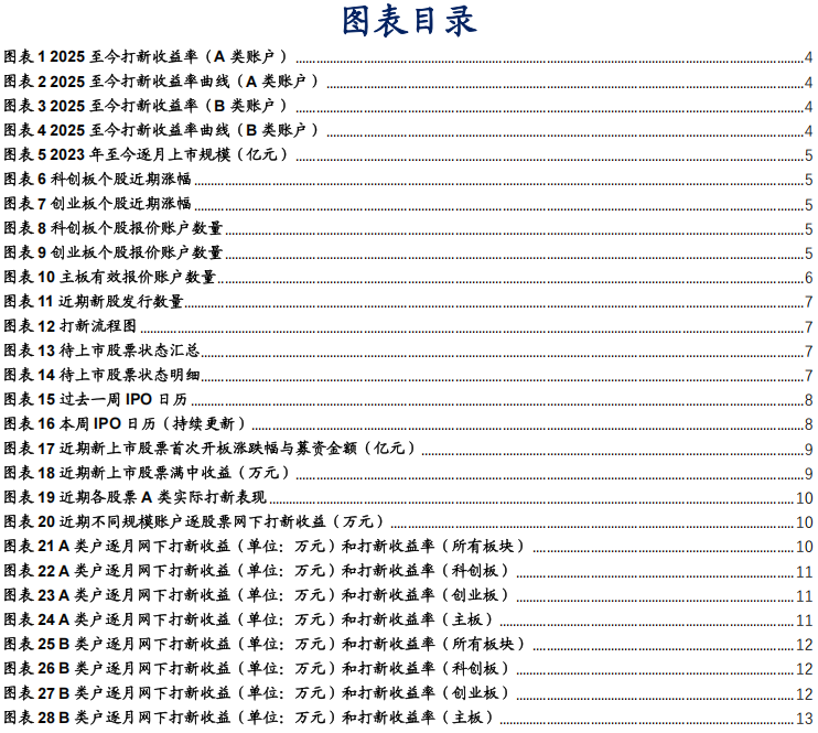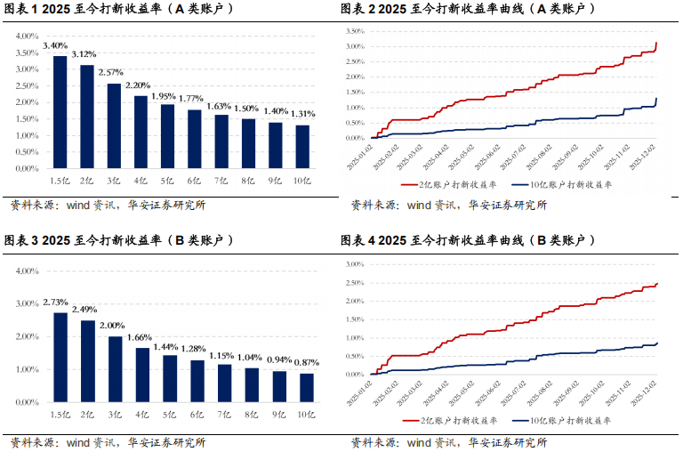 我们跟踪近期科创板+创业板+主板的网下打新市场表现,假设所有主板、科创板、创业板的股票都打中,且上市首日以市场均价卖出,忽略锁定期的卖出限制,自2025年初起截至2025/12/5,A类2亿规模账户打新收益率3.12%,B类2亿规模账户打新收益率2.49%;A类10亿规模账户打新收益率1.31%,B类10亿规模账户打新收益率0.87%,如图表1、图表3所示,2025年以来的累计打新收益率曲线如图表2、图表4所示,A类分多档询价的股票以A类平均中签率计算打新收益率。