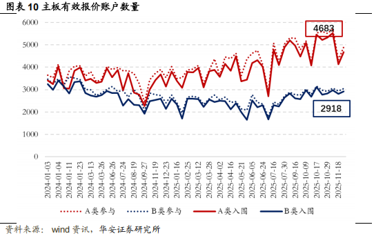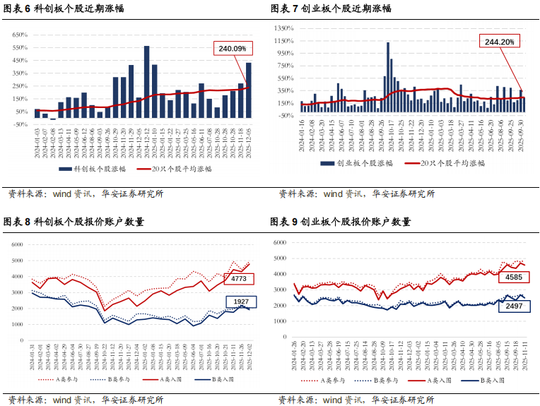跟踪近期科创板+创业板+主板的网下打新市场表现,假设所有主板、科创板、创业板的股票都打中,且上市首日以市场均价卖出,忽略锁定期的卖出限制,自2025年初起截至2025/12/5,A类2亿规模账户打新收益率3.12%,B类2亿规模账户打新收益率2.49%;A类10亿规模账户打新收益率1.31%,B类10亿规模账户打新收益率0.87%。滚动跟踪近期20只新股上市后的涨幅表现,其中科创板个股上市首日平均涨幅为240.09%,创业板个股上市首日平均涨幅为244.20%。跟踪近期新股的有效报价账户数,最近一只科创板新股A类有效报价账户数量为4773,B类有效报价账户数量为1927。最近一只创业板新股A类有效报价账户数量为4585左右,B类有效报价账户数量为2497。最近一只沪市主板新股A类有效报价账户数量为5534,B类有效报价账户数量为2976,最近一只深市主板新股A类有效报价账户数量为4683,B类有效报价账户数量为2918。
