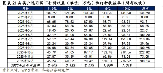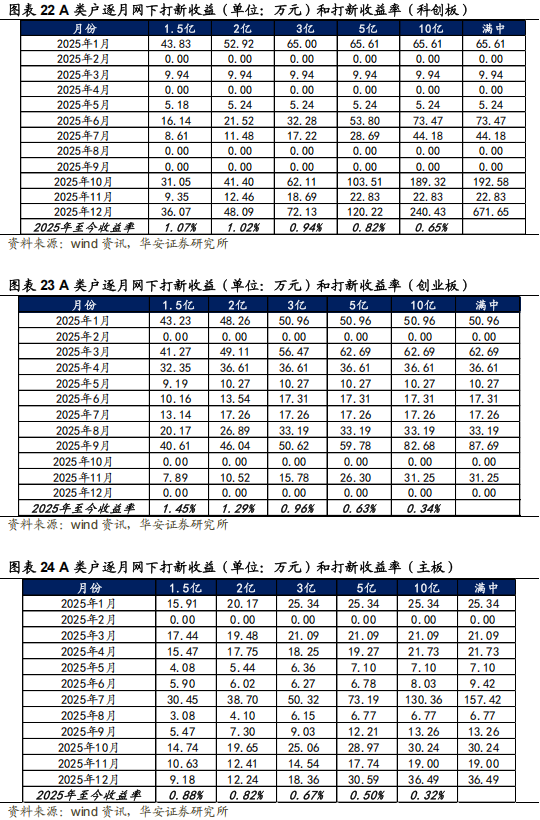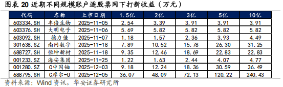 我们测算了不同规模资金的网下A类打新收益。假设使用网下A类平均中签率、账户参与所有新股打新、科创板和创业板报价全部入围、资金配置一半沪市一半深市且股票满仓、按首次开板日均价卖出、在90%的资金使用效率下我们测试不同账户规模下的逐股票网下打新收益。图表20列举了在1.5亿、2亿、3亿、5亿、10亿账户规模下,以A类平均网下中签率为例,假设科创板和创业板全部入围,近一个月内(2025年11月5日至2025年12月5日)上市新股的网下打新收益。