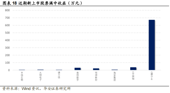 用A类平均中签率估算,我们测算当A类机构对近两个月内新上市的股票全部顶格打满时,每只股票可获得的满中收益。我们使用首次开板日均价和发行价格计算每只股票的上市收益。每只股票满中收益的具体计算方法为: