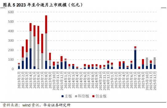 2023年以来逐月上市的新股规模如图表5所示。2025年12月沪深两市已上市2只新股,募资规模124.40亿元。