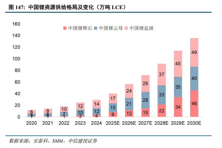 中国云母锂扰动不断,盐湖及辉石项目将进入增量期。2025年,预计国内锂辉石、锂云母、锂盐湖提锂产量分别为8.7万吨、14.7、17.0万吨,由于江西地区云母锂供给扰动不断,环保、权证等问题陆续暴露影响产量,加之价格低位,产量增速较之前有所放缓。此前因云母锂矿地处江西,基础设施条件好,矿埋藏浅,政府支持,放量较快,而国内盐湖项目、辉石项目面临项目推进缓慢、采矿证获取较慢等困难。随着盐湖、辉石项目权证陆续取得、各项手续推进,未来产量稳步增长,进入增量期,辉石将是产量增速最高的类型。预计2025-2027年,国内锂资源产量40.3/56.6/72.1万吨。