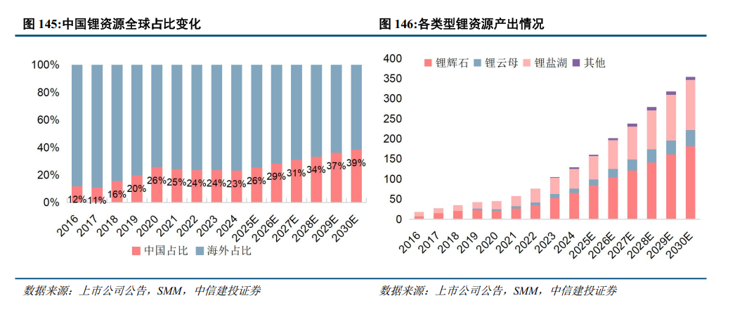 全球供给格局更加多元,中国正逐步成为最重要的力量。锂矿供给格局从最早的“三湖一矿”变成“三湖七矿”,再到现在百花齐放。目前澳洲仍为全球最重要的锂原料生产地区,但产量占比已经从几年前的“半壁江山”降至目前的不足三成;其次是南美盐湖在全球供给占比也降至27%,非洲异军突起,已经占到了10%以上的份额。中国是全球在产锂矿资源种类最多样的国家,盐湖、辉石、云母并存,在全球的供给占比已经从不足20%增至目前的26%,预计到2030年中国原生锂资源产量全球占比将达到40%。如考虑中资企业在海外锂资源权益,占比将超过50%。