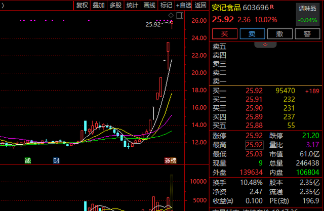 12月9日晚间,安记食品发布股票异动公告,公司股票于12月2日至12月9日连续6个交易日以涨停价收盘,其间累计涨幅77.14%,公司股价短期上涨幅度较大,高于同期行业及上证指数涨幅,存在市场情绪过热情形及较高的炒作风险,可能存在短期涨幅较大后的大幅下跌风险。敬请广大投资者注意二级市场交易风险。