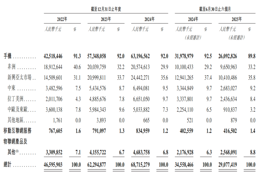 传音控股瞄准新兴市场用户使用需求,其大部分收入来自非洲和新兴亚太市场,2022年至2024年,非洲市场手机产品的营收占比已由40.6%下降至29.9%,而营收额则小幅上涨,这意味着,传音控股在保持非洲市场优势的同时也在不断扩展其他市场用户。以下为报告期间,该公司按地区划分的营收额及较总营收的占比: