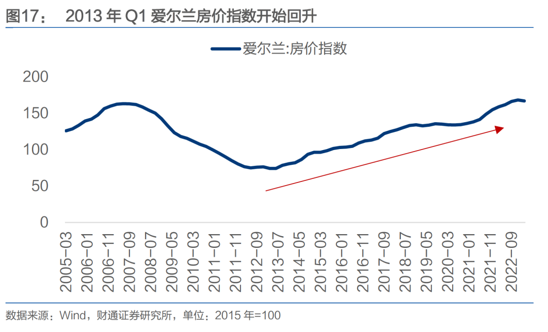 银行风险缓释后信贷环境的改善叠加政策支持、经济及就业市场的回暖,房地产核心指标也逐步修复。2007年至2012年,爱尔兰房价指数累计跌幅超50%;自 2013 年一季度起,该指数开启反弹走势;截至 2022 年三季度,房价指数已回升并突破2007年的历史峰值。