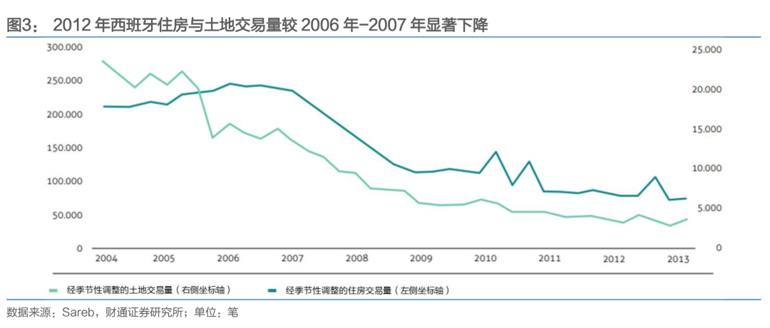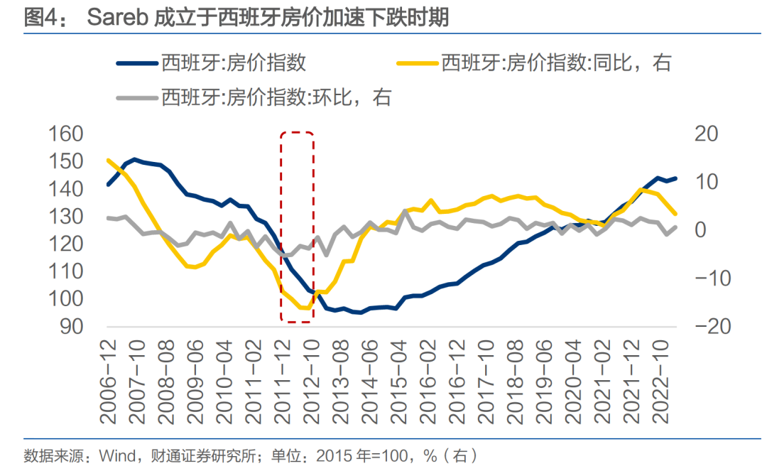 一个关键的问题在于,为什么是 2012 年?西班牙房价自 2007 年四季度便步入下滑通道,至 2012年四季度累计跌幅已超 30%,为什么西班牙政府直到 2012年年末才成立Sareb来推进“收储”? 我们理解这一时点的选择,可能基于两方面因素的考量: