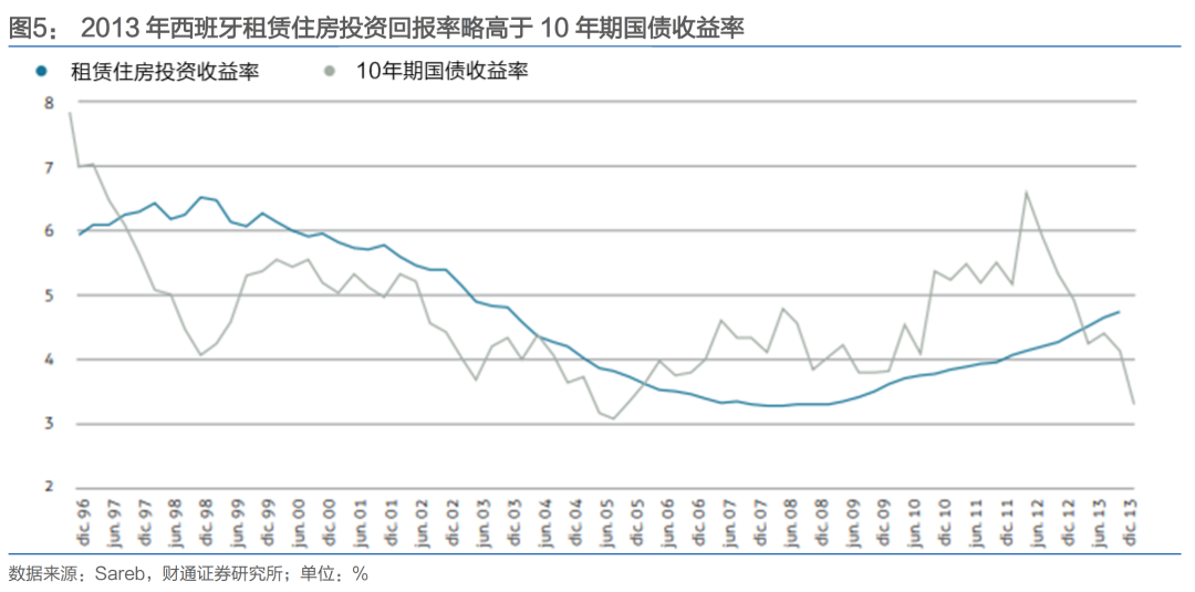 二是政府介入的可行性。收储机构承载了剥离不良资产的公共政策使命,但也需要保护国家财政和纳税人利益。以Sareb为例,其法定目标除转移问题资产相关风险外,还包括最小化公共财政支出、最大化资产回收价值等,本质是通过优化资产处置实现债务自偿、避免公共资金过度兜底。因此,问题资产收回后,是否可以产生足额现金流覆盖债务压力甚至实现盈利,决定了收储工作推进的可能性与实际成效。从这一逻辑出发也就不难理解为什么政府选择在 2012 年末介入。随泡沫挤出,该时点房地产市场的估值已回落至相对合理的偏低水平,资产配置的吸引力逐步恢复,政府也有了更大的议价权。Sareb 年报显示,2013 年西班牙租赁住房投资回报率达到4.7%,这一水平已略高于10年期国债收益率,同时也高于高息存款等其他金融产品。