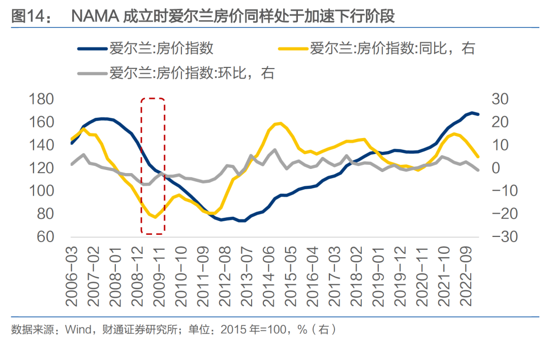 为解决爱尔兰银行业严重危机,2009 年爱尔兰政府成立了国家资产管理局(NAMA)。4月,爱尔兰政府宣布NAMA成立计划,同年12月该机构成立。与西班牙Sareb类似,2009年NAMA成立时爱尔兰房价同样处于加速下行阶段。