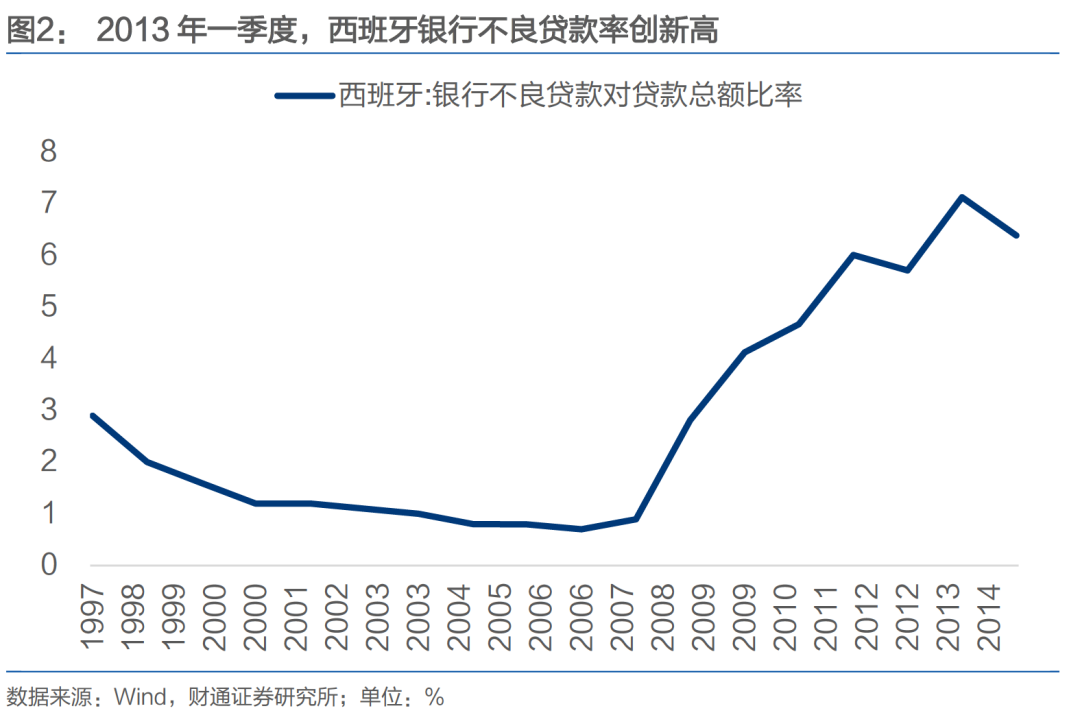 受房地产市场萎缩的拖累,银行坏账率也攀升突破历史新高。前期地产繁荣阶段银行过多参与房地产相关产业的放款,这也导致泡沫破灭后坏账急剧增加,银行资产质量恶化。2013 年西班牙银行不良贷款率上升至 7.12%,创 1997 年以来的新高。