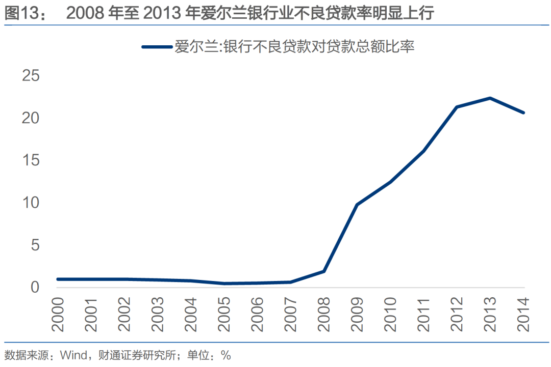 随金融危机爆发,银行融资受阻,房地产相关信贷收缩。2007年全年爱尔兰住宅抵押贷款发放量同比减少22.5%,金额下降15%至338亿欧元。再加上投机资金退出,市场恐慌情绪蔓延,形成了“抛售→房价下跌→更多抛售”的恶性循环。2008年全年房价指数下跌7%,2009年再跌19%。房地产泡沫的破裂带动了银行业坏账率的飙升,2010 年爱尔兰银行业不良贷款率突破 10%,2013 年达到22%的峰值。