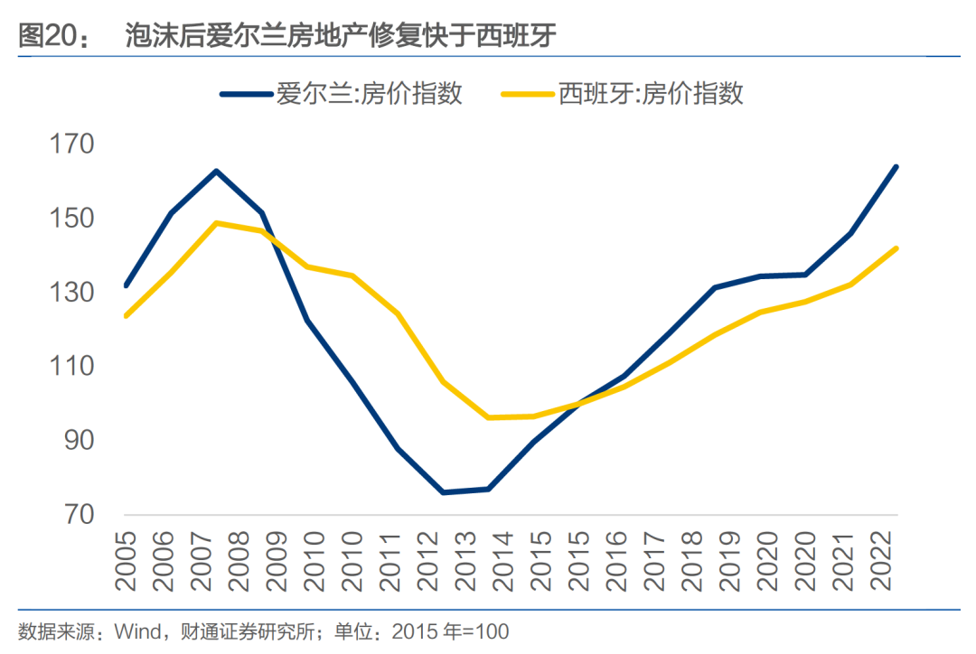 这归因于西班牙与爱尔兰房地产市场修复程度的分化,泡沫之后爱尔兰地产在回暖节奏与幅度上均有明显的领先优势。2022 年爱尔兰房价指数较 2012 年低点已上行116%,年均增长8%;同年西班牙相比2013年低点仅上行48%,尚未突破泡沫前期峰值水平,年均增幅也只有4%左右。
