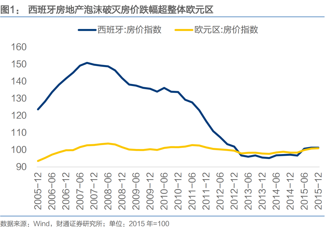 上世纪90年代中期开始,在抵押贷款市场自由化、税收优惠、移民住房需求以及国内外投资需求等因素驱动下,西班牙房地产市场蓬勃发展。2007年美国次贷危机爆发,西班牙房地产泡沫也随之破灭。2007年三季度至2014年一季度,西班牙房价下跌超35%,跌幅显著超出欧元区整体水平。
