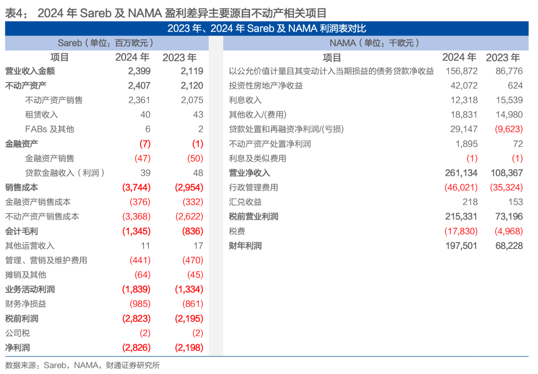 对比Sareb及NAMA 过去两个财年利润表也可以发现,两者盈利表现差异主要 源于不动产相关项目,包括不动产资产处置产生的净利润、不动产净值上升带来的贷款公允价值增值等。