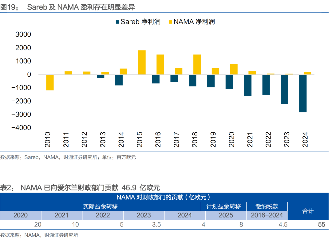 但两者也存在区别,具体表现为收储后资产处置的盈利与债务清偿情况。至2024年,Sareb 持有的不良资产组合减少至 189.99 亿欧元,较初期的507.81 亿欧 元下降62.6%,但偿还的优先债务占比不到二分之一,也仍处于亏损状态。而爱尔兰NAMA现已无债务:优先债务部分(302亿欧元)已于2017年10月全额偿还;截至 2020 年 3 月,次级债务(15.93 亿欧元)也已被全部赎回。此外NAMA已向本国财政部转移处置盈余。NAMA 计划在其整个项目周期内向财政部门贡献 55 亿欧元,在全部偿还债务(318 亿欧元)和股权(5600 万欧元)后,它开始将剩余资金转交给财政部门。2016年到2024 年底,NAMA 已向国库支付了总计 46.9 亿欧元(包括已缴纳的税款)。