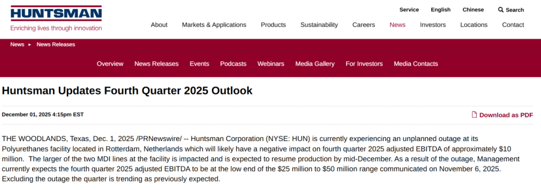 而据此前报道,亨斯迈披露其位于荷兰鹿特丹的聚氨酯工厂遭遇计划外停车事故。故障主要影响工厂两条MDI生产线中产能较大的一条——年产28万吨生产线,另一条年产16万吨生产线虽正常运转,但受行业供需联动影响,后续市场波动已逐步显现。这也能看出,产量缩水带来的直接影响就是价格上涨。