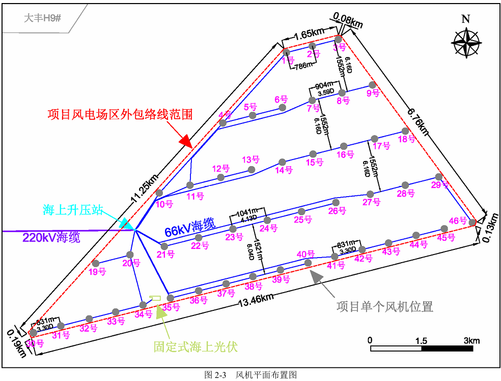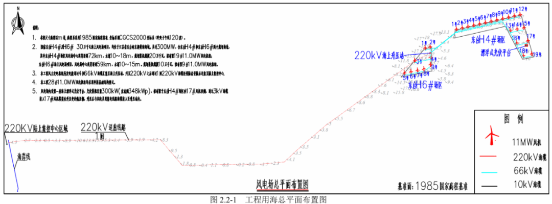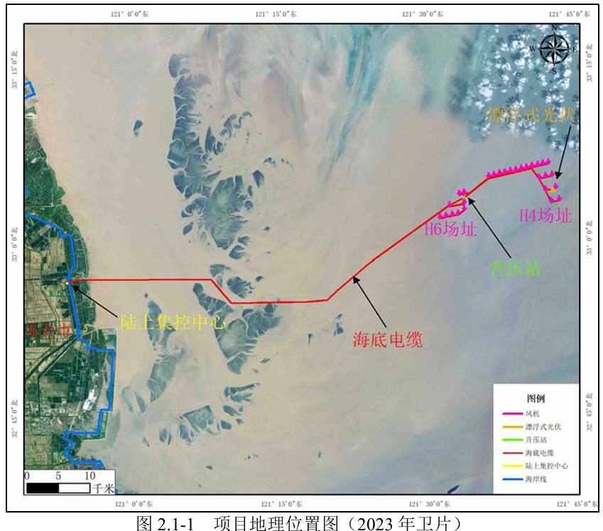 该项目包含东台H4#和H6#两个场区,总装机容量为308.3MW,拟安装28台单机容量为11MW的风电机组(东台H4#场区209MW拟安装19台,东台H6#场区99MW拟安装9台),并在H4#场区内融合建设一处0.3MW的漂浮式光伏平台。项目风电场配套建设1座220kV海上升压站(带直升机平台)和1座220kV陆上集控中心,漂浮式光伏平台所发电能经1回10kV海缆送至H4#场区17号风机,风电机组及漂浮式光伏平台所发电能经4回66kV海缆汇至220kV海上升压站,经主变升后以1回220kV海缆在东台河闸南侧岸线处登陆后送至陆上集控中心,后考虑以1回220kV输电线路接入系统电网变电站。
