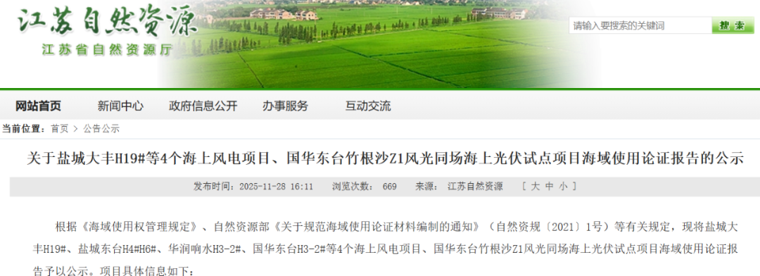 近日,江苏省自然资源厅发布《关于盐城大丰H19#等4个海上风电项目、国华东台竹根沙Z1风光同场海上光伏试点项目海域使用论证报告的公示》。