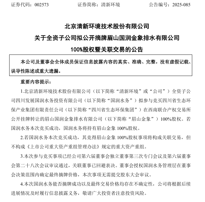 12月9日晚间,清新环境公告称:公司全资子公司四川发展国润水务投资有限公司(下称“国润水务”)拟“出手”竞买控股股东四川省生态环保产业集团有限责任公司(下称“四川省生态环保集团”)挂牌转让的眉山国润金象排水有限公司(下称“眉山金象”)100%股权。