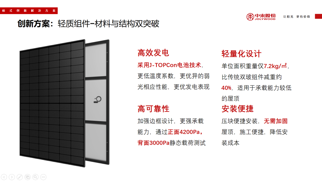 轻质组件通过材料与结构双重突破,在保证高强可靠的同时大幅降低重量,适用于承载力有限的工商业与户用屋顶。