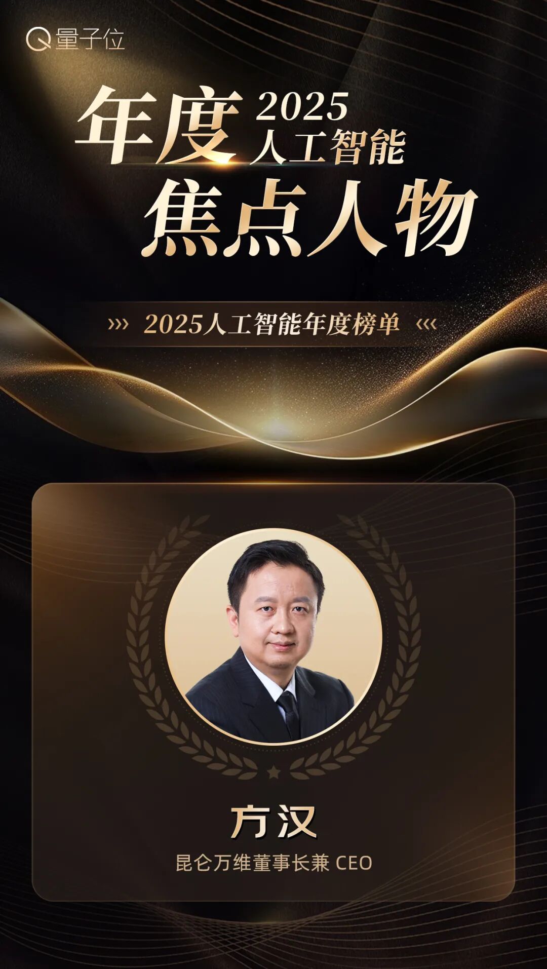 昆仑万维董事长兼CEO方汉入选「2025人工智能年度焦点人物」