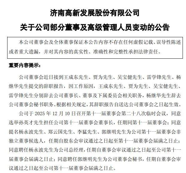 12月10日消息,济高发展(600807)发布公告称,因工作原因,王成东先生、贾为先生、吴宝健先生、雷学锋先生分别辞去公司董事长、董事及下属委员会相关职务,杨继华先生辞去公司董事会秘书职务。