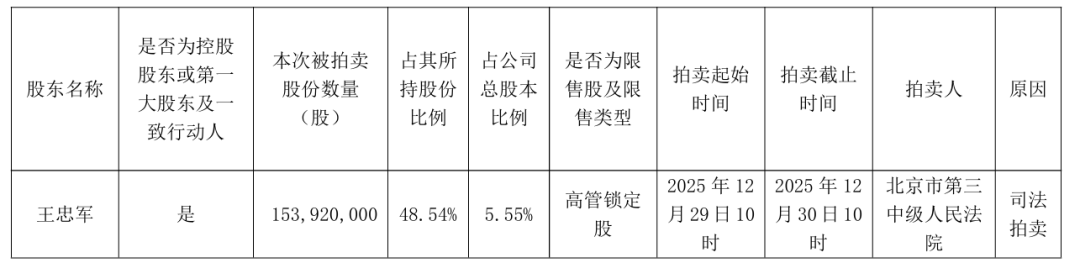 10日晚间,华谊兄弟同时公告称,公司控股股东、实际控制人王忠军所持公司1.54亿股股票已被北京市第三中级人民法院于2025年12月8日10时至2025年12月9日10时(延时的除外)在京东网络司法拍卖平台上公开拍卖。经公司查询,根据京东网络司法拍卖平台页面显示,一拍已流拍。该部分股份第二次司法拍卖时间为2025年12月29日10时至2025年12月30日10时(延时除外)。