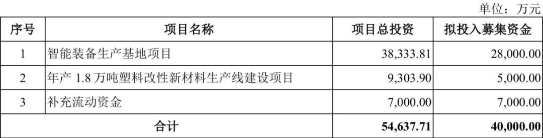 此次再融资拟募集4亿元,用于智能装备生产基地项目、年产1.8万吨塑料改性新材料生产线建设项目、补充流动资金。
