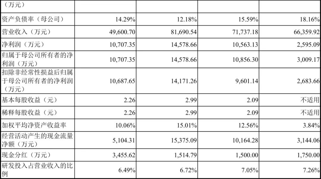 报告期内,发行人营业收入分别为6.64亿元、7.17亿元、8.17亿元、4.96亿元,对应归母净利润分别为3009.17万元、1.09亿元、1.46亿元、1.07亿元。