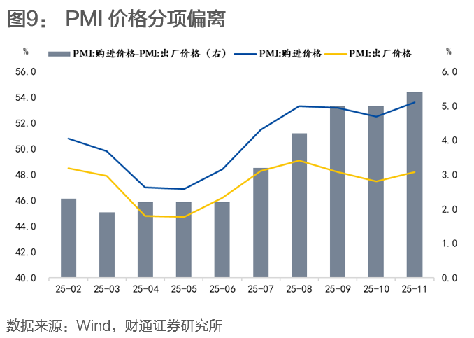 PPI上行可能与原材料购进价格上涨更相关,未来预测时需要以PMI中的主要原材料购进价格指数为锚。11月出厂价格指数上行0.7个百分点至48.2%,主要原材料购进价格指数上行1.1个百分点至53.6%。正如我们此前报告《PPI超预期,有色能否全面拉动PPI?》所述,8月以来PMI出厂价格和购进价格的预测结果出现连续偏离,PPI环比修复主要依靠购进价格分项支撑;另一方面,需求不畅导致三季度上游价格回升有一定滞后效应。