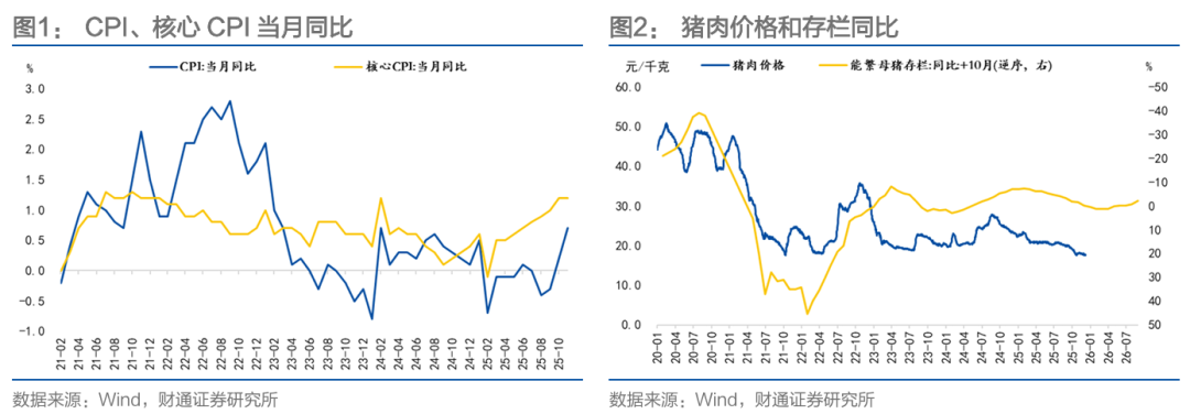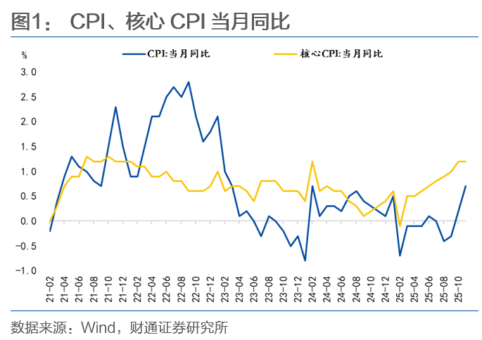 客观数据方面,11月CPI同比较前月上升0.5个百分点至0.7%,为2024年3月份以来最高。其中,食品项环比明显强于去年,对CPI同比读数形成支撑。核心CPI同比较前月持平,为1.2%。