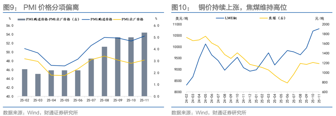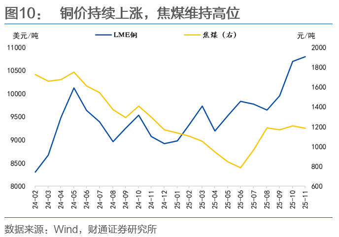 行业层面,煤炭、有色支撑PPI环比小幅转正。从各行业PPI环比的拉动率看,有色金属冶炼及压延加工业、煤炭开采和洗选业是10、11月PPI环比小幅转正的主要支撑项。从主要商品来看,煤炭价格持续回升除季节性因素外主要受到反内卷政策驱动,铜价大涨则受到全球供给扰动和AI企业资本开支推升需求导致。