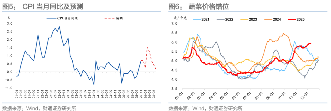 一是鲜菜价格高峰错位,短期内形成支撑。2024年受极端天气影响蔬菜价格高点在9月,四季度价格大幅回落,而2025年极端天气推升四季度蔬菜价格,预计短期内鲜菜项仍将对食品项形成支撑。