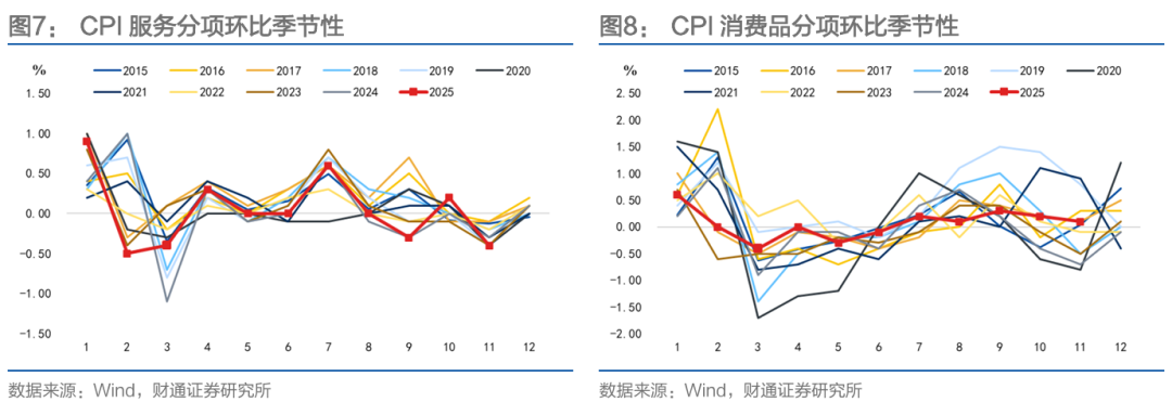 非食品项整体低于季节性,但衣着上涨高于季节性。具体来看,11月非食品项环比-0.2%,弱于季节性水平(近10年均值-0.05%)。其中,衣着高于季节性,主要受冬装换季上新集中至11月影响;居住、交通通行环比明显低于季节性,主要受房租仍处于弱势和原油价格拖累。