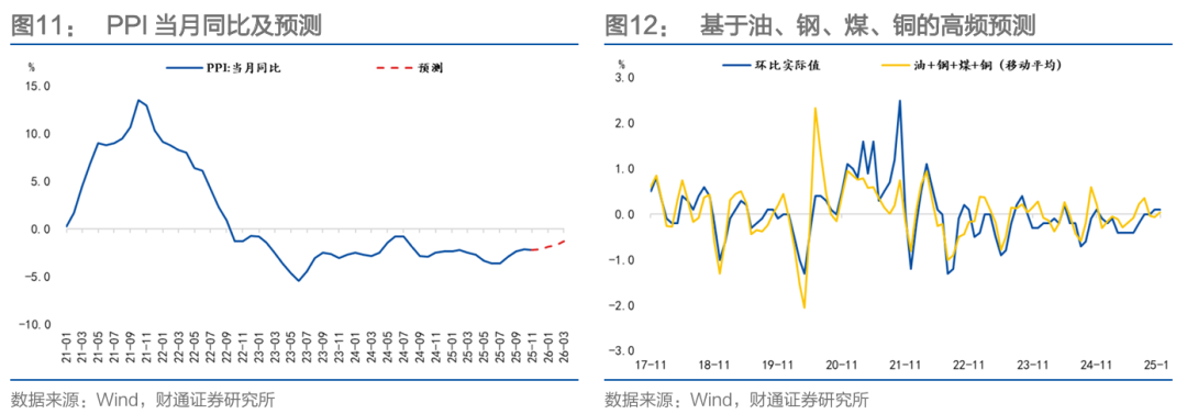 自下而上来看,商品价格面临的主要问题还是需求不足,我们预计明年一季度钢价在供需双弱的格局下继续磨底、铜价在供给扰动和AI企业资本开支增长下保持上涨、油价维持震荡偏弱格局、煤价受反内卷影响小幅上涨,在这一情境下,PPI环比保持在略大于0附近,3月份PPI同比将回升至-1.3%附近,同比转正或还需等到明年三季度。