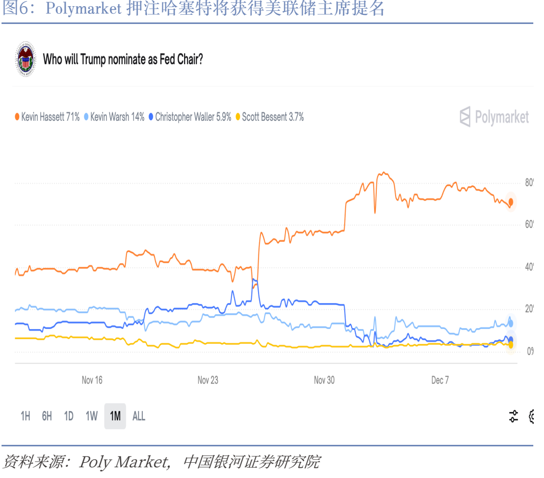 关注点八:2026年美联储面临地方与主席的换届。(1)当前的投票体系由7名理事、纽约联储行长和4名轮值的地方行长构成,其中2026年2月将迎来新一轮地方行长的年度轮换,包括费城联储的安娜·保尔森、克利夫兰联储的贝丝·哈马克、达拉斯联储的洛里·洛根和明尼阿波利斯联储的尼尔·卡什卡利,将接替现有的波士顿、芝加哥、圣路易斯和堪萨斯城的行长进入FOMC票委名单。(2)美联储主席鲍威尔的主席任期将于2026年5月15日正式结束,特朗普拥有完全的提名权。若未被重新提名或未获参议院确认,他将卸任主席,但仍可继续担任理事直到2028年。(3)目前美联储主席候选人范围已缩小至5人,分别是现任理事鲍曼和沃勒、白宫国家经济委员会主任哈塞特、前理事沃什以及贝莱德固定收益负责人里德。Polymarket显示,哈塞特的提名概率显著领先。