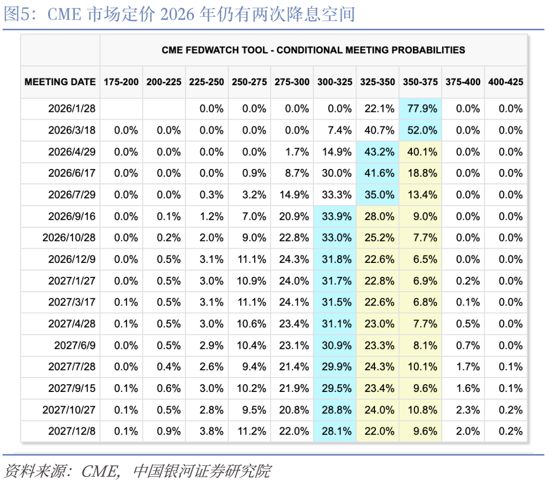 关注点六:12月点阵图显示2026年仅剩一次降息空间。12月点阵图显示,美联储对2026年的降息预期仅保留一次25个基点的空间,并预计2027年再降息一次。截至北京时间11日6时,CME的市场定价仍反映2026年可能出现两次降息,分别在4月和9月各一次25个基点,2027年则无降息安排。若美国劳动力市场和经济数据未出现超预期下行风险,我们维持对2026年两次降息的判断。
