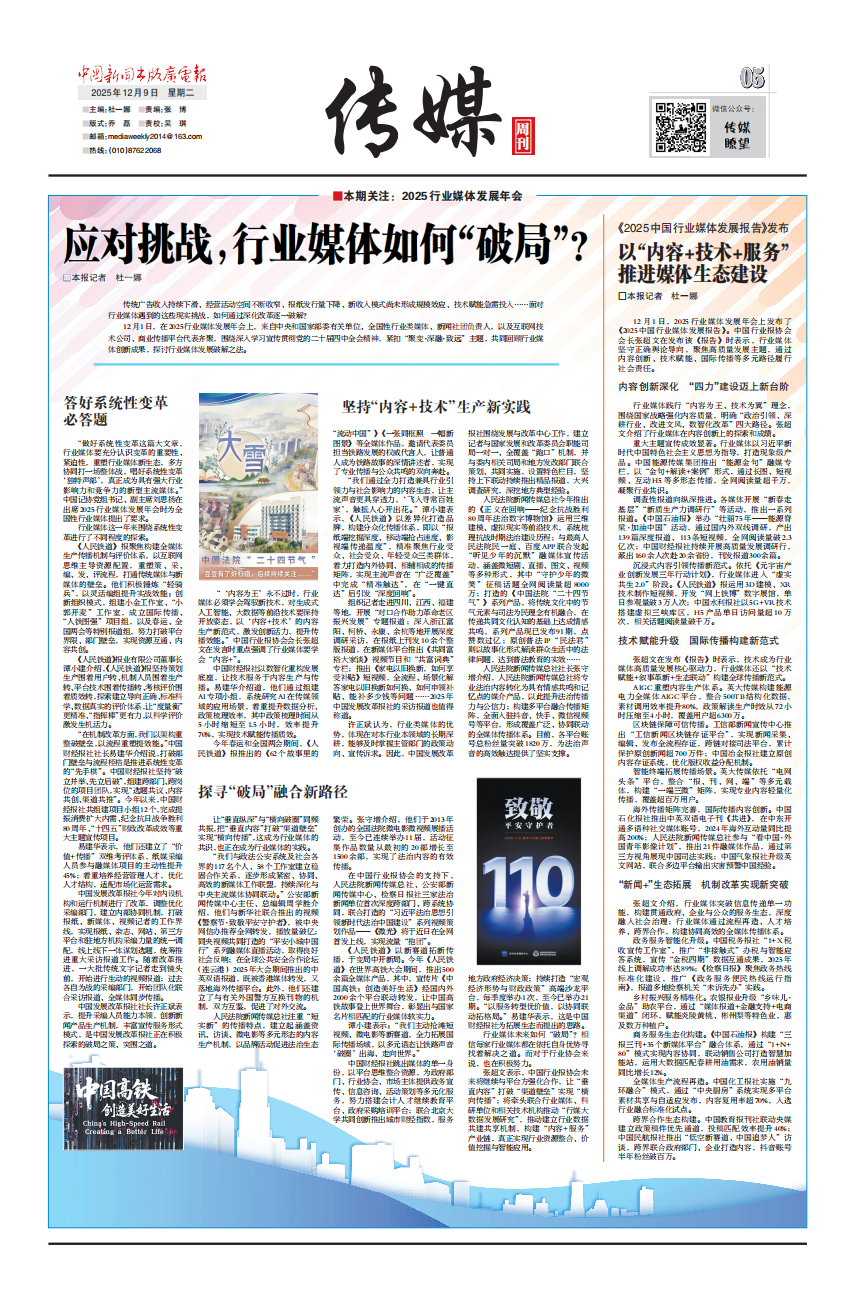 张超文介绍,行业媒体突破信息传递单一功能,构建贯通政府、企业与公众的服务生态,深度融入社会治理;行业媒体通过流程再造、人才培养、跨界合作,构建协同高效的全媒体传播体系。
