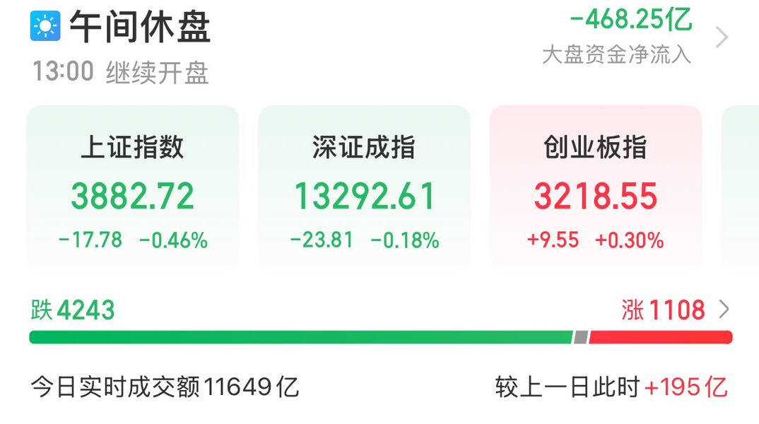截至午盘,上证指数跌0.46%,深证成指跌0.18%,创业板指涨0.3%,北证50跌0.09%。全市场成交额1.16万亿元,较上日成交额放量195亿元。