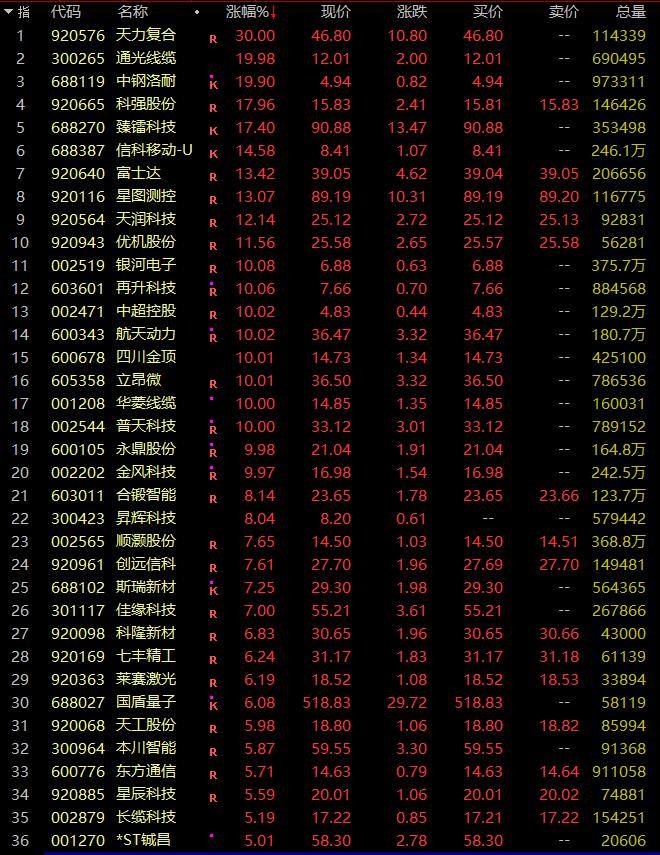 其中,商业航天板块活跃,36股涨幅超5%,天力复合、通光线缆、中钢洛耐等14股涨停。