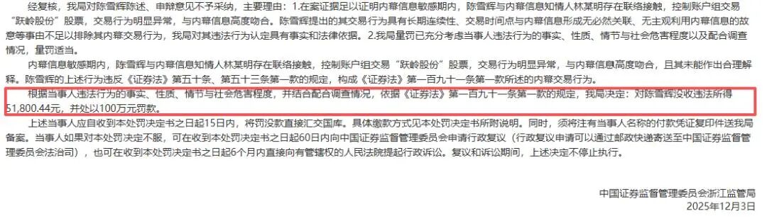经复核,浙江证监局对陈雪辉陈述、申辩意见不予采纳。根据当事人违法行为的事实、性质、情节与社会危害程度,并结合配合调查情况,依据《证券法》第一百九十一条第一款的规定,浙江证监局决定:对陈雪辉没收违法所得51800.44元,并处以100万元罚款。