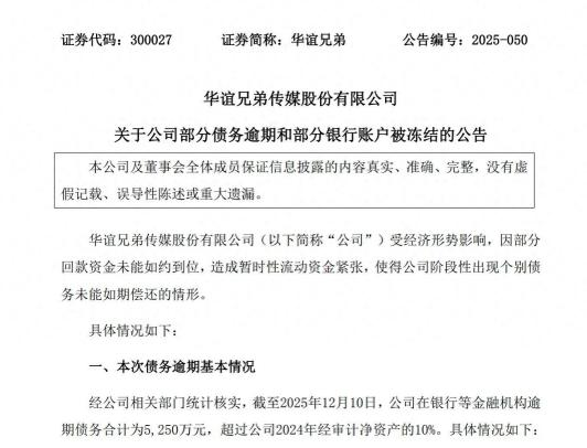 12月10日,华谊兄弟(300027.SZ)发布公告披露,截至当日公司在金融机构的逾期债务合计达5250万元,该金额已超过其2024年经审计净资产的10%,同时公司部分银行账户被冻结约人民币64万余元及少量美元。公告同时透露,公司正通过与金融机构协商续贷、处置非核心资产等方式化解危机。